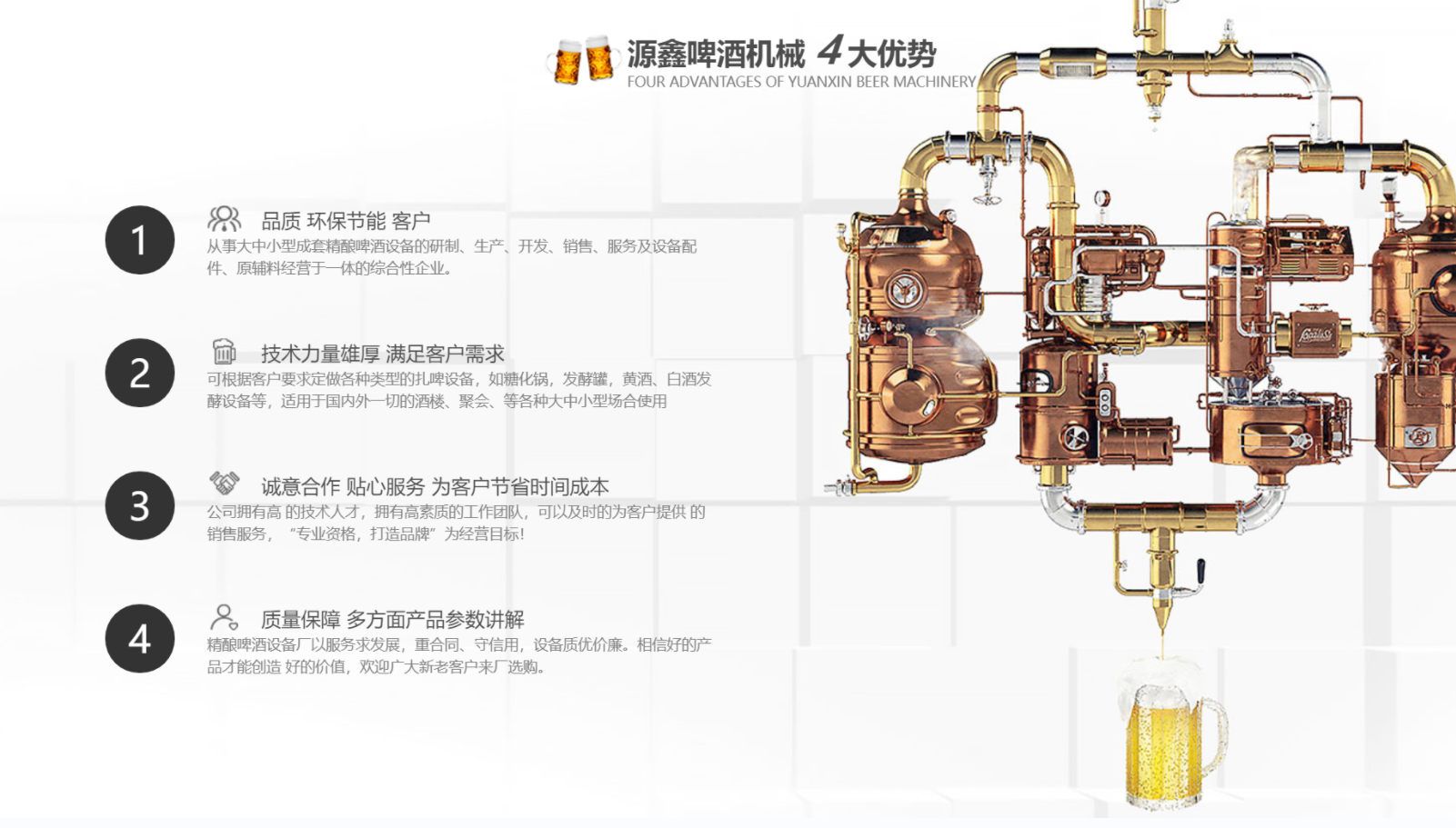 南陽市源鑫啤酒機(jī)械設(shè)備有限公司位于歷史文化名城一-南陽,從事大中小型成套啤酒、白酒自釀設(shè)備的研制、生產(chǎn)、開發(fā)、銷售、服務(wù)及設(shè)備配件、原輔料經(jīng)營于一體的綜合性企業(yè)。公司可根據(jù)客戶要求定做各種類型的扎啤設(shè)備,如糖化鍋,發(fā)酵罐,黃酒、白酒發(fā)酵設(shè)備等,適用于國內(nèi)外一切的酒樓、餐廳、家庭.聚會、酒吧等各種大、中、小型場合使用。公司擁有技術(shù)人才,擁有高素質(zhì)的工作團(tuán)隊(duì),可以及時(shí)的為客戶提供**的銷售服務(wù)。公司以“專業(yè)資格,打造品牌”為經(jīng)營目標(biāo),“卓越質(zhì)量,信賴價(jià)格”為經(jīng)營宗旨,以質(zhì)量求生存,以服務(wù)求發(fā)展,重合同、守信用,設(shè)備質(zhì)優(yōu)價(jià)廉。相信好的產(chǎn)品才能創(chuàng)造 好的價(jià)值,歡迎廣大新老客戶來廠選購。...